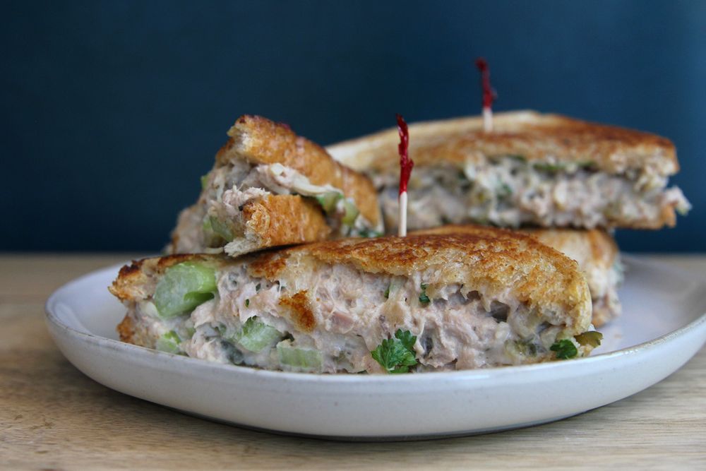 Tuna salad topped with melted cheese and crunchy pickles for extra flavor.